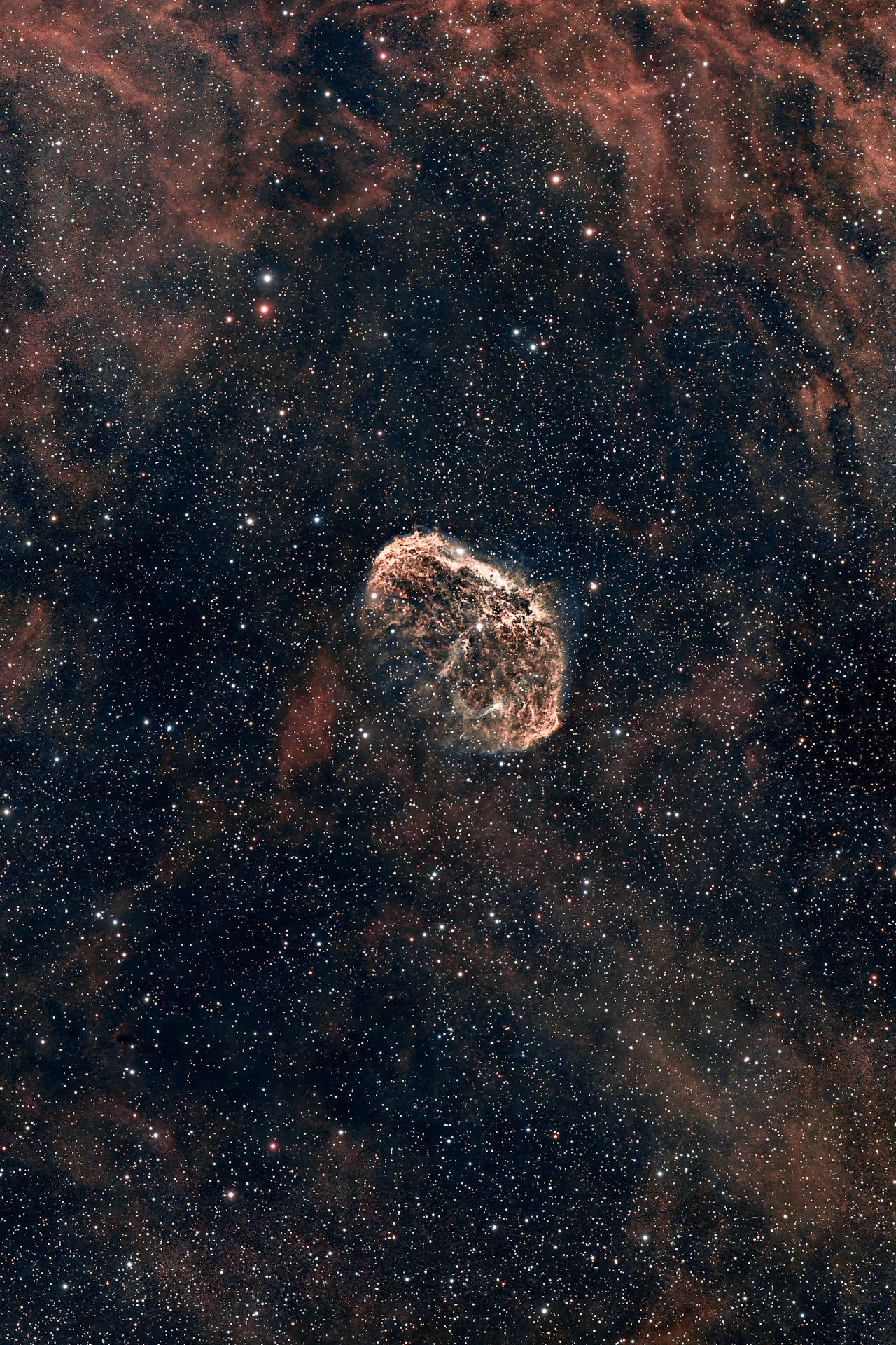 A NGC 6888, também conhecida como Nebulosa Crescente, é uma nebulosa de emissão localizada na constelação do Cisne (Cygnus), a cerca de 4.700 anos-luz da Terra. O objeto foi formado pelos ventos estelares intensos da estrela massiva Wolf-Rayet WR 136, que expulsa camadas da sua atmosfera a velocidades de milhões de quilómetros por hora. Quando esse material colide com o gás previamente ejetado numa fase anterior da estrela, cria-se esta estrutura em forma de concha, rica em emissões de hidrogénio (Hα) e oxigénio (OIII).