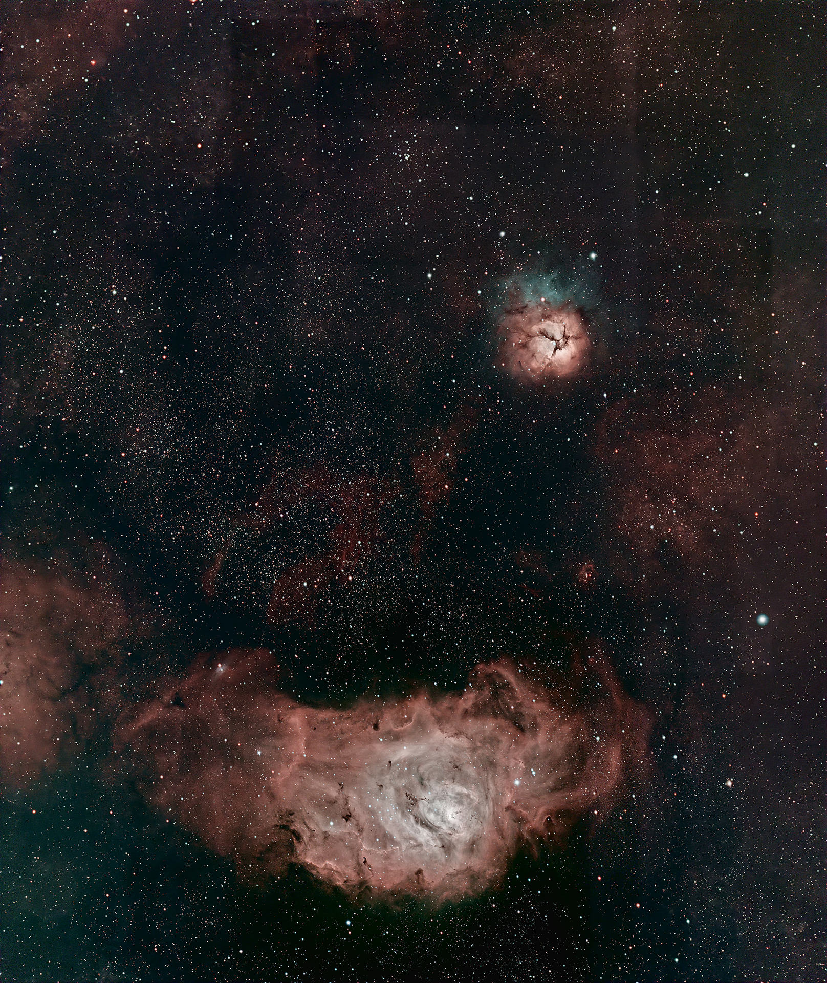 No pico do verão, quando a Via Láctea corta o céu do sul, a constelação de Sagitário oferece dois clássicos irresistíveis: a Nebulosa da Lagoa (M8) e a Nebulosa da Trífida (M20). A imagem acima foi feita com o Seestar S50, ao longo de várias noites de julho e agosto, construindo um mosaico de campos vizinhos. No total, ficaram guardadas ~4 000 exposições de 30 s — cerca de 33 h 20 min de integração efetiva.